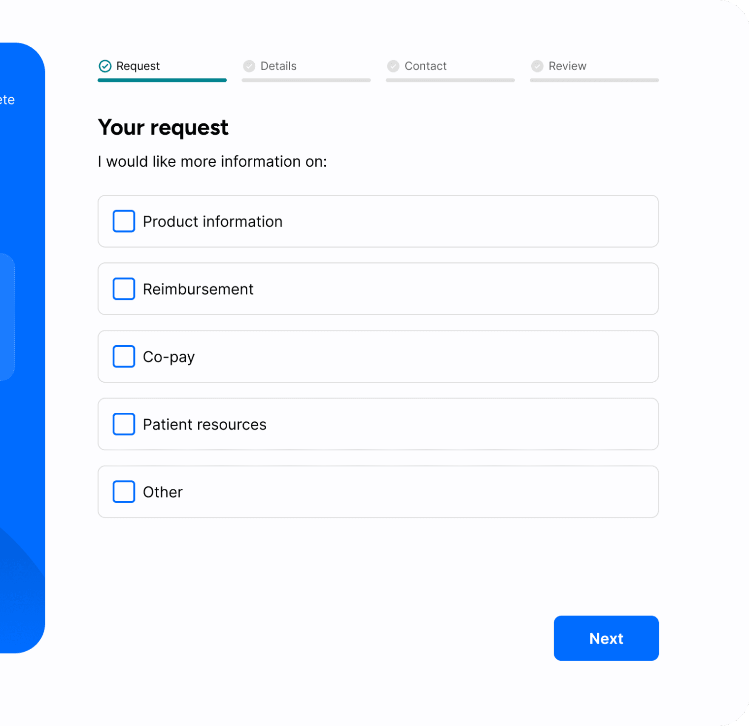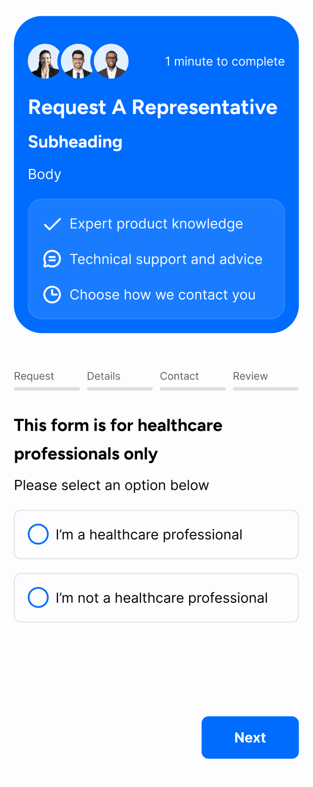 Led redesign of a core sales funnel connecting physicians with brand representatives, using stakeholder interviews and data analysis to address drop off and clarity issues. Simplified the flow through progressive disclosure and clearer entry points, resulting in a more focused, conversion oriented experience.